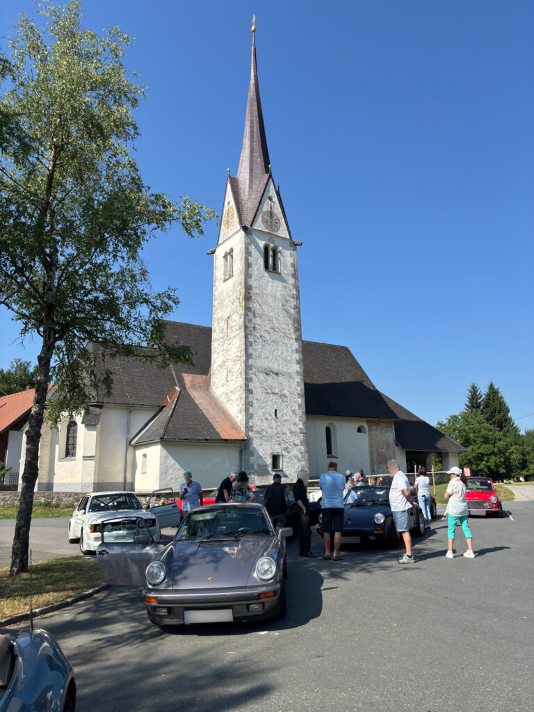 Der Samstag führt uns zunächst nach Tarvisio in Italien, das auch für seinen Markt bekannt und berüchtigt ist, so dass einige nicht widerstehen konnten. Weiter ging es nach dieser Station vorbei am Raiblsee nach Slowenien und über den Predilpass. Weiter ging es dann durch das Trentatla dem Tal der Soca. Nach dem Mittagessen in Soca ging es über den reizvollen Vrsic-Pass weiter nach Kranjska Gora. Kurz nach der Passhöhe mussten wir noch eine kleine Zwangspause einlegen, da uns eine Kuhherde auf der Straße aufhielt. Von Kranjska Gora aus ging es zurück über den Wurzenpass zurück nach Hermagor. Kurz vor dem Ziel mussten die Cabriofahrer noch ihre Dächer schließen, da ein stärkerer Regenschauer uns entgegen kam. Nach dem wieder sehr guten Abendessen genossen noch einige das Feuerwehrfest, das an diesem Abend auf dem Hotelgelände statt fand.